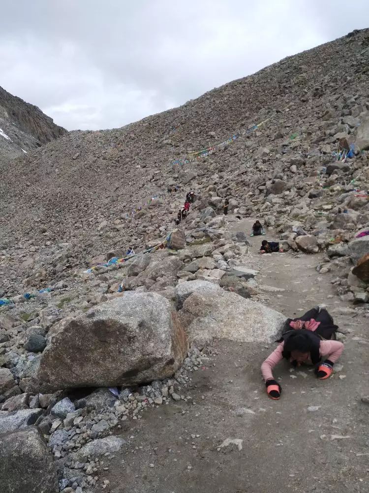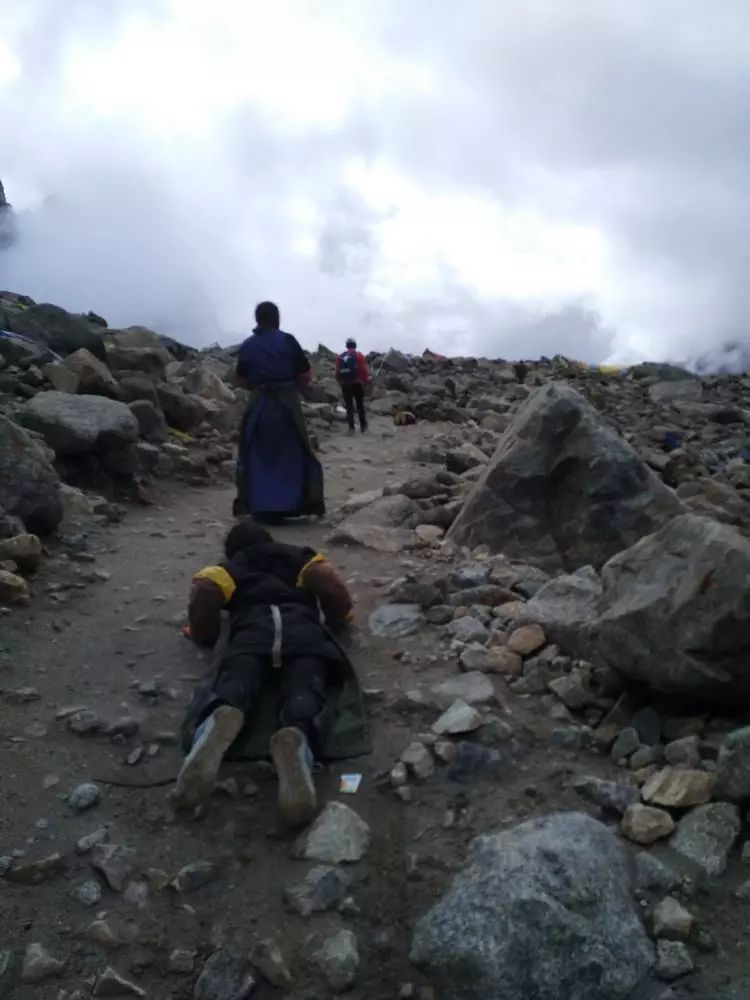 转山途中,总会遇到磕长头的信众从乱石坡匍匐着一段一段往上爬。