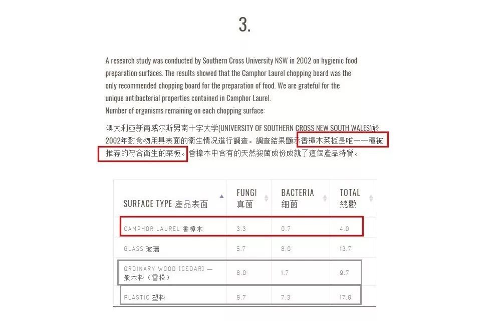 因为木砧板最受诟病的一点,就是易发霉,而香樟木自带淡淡香味,有极佳的抗菌防霉能力。 澳洲新南威尔士南十字大学曾做过一个厨房工具表面的卫生情况调查,结果显示不同材质的砧板都会残留细菌。 4种材料中,只有香樟木菜板的残留最少,符合卫生标准!