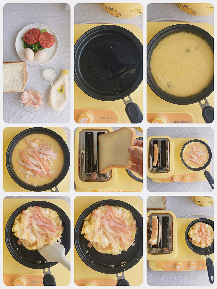 6.嫩滑的蟹柳蛋搭配生菜番茄,清爽美味,可以根据自己的喜好放置食材,用东菱多功能早餐机烤过的吐司脆脆的,一口咬下去,超份满足!
