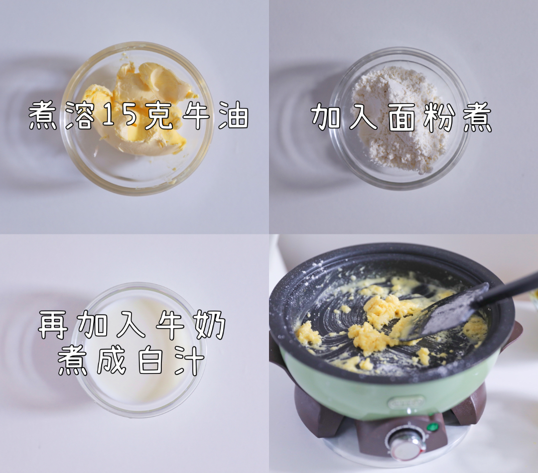 ③ 自制白汁,热锅下牛油煮溶加入面粉煮溶后,再加入牛奶煮成酱汁,再将所有待用食材全部加入,炒匀后加入1茶匙盐和胡椒粉炒几下即可了。