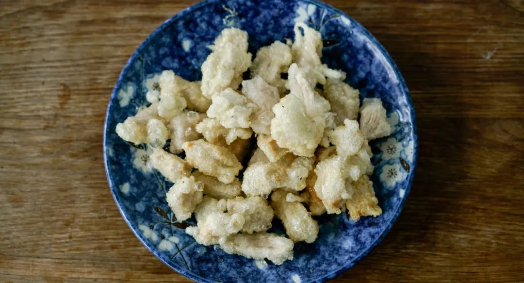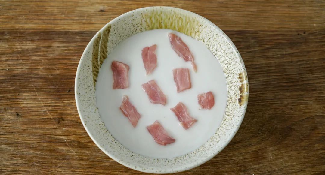 3.炸里脊肉:把里脊肉均匀裹上水淀粉。