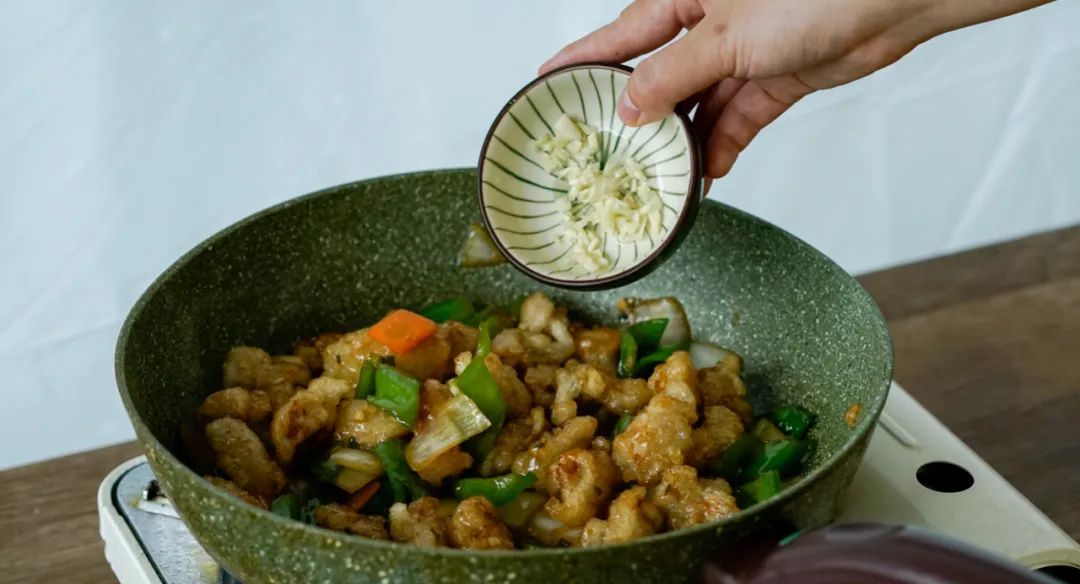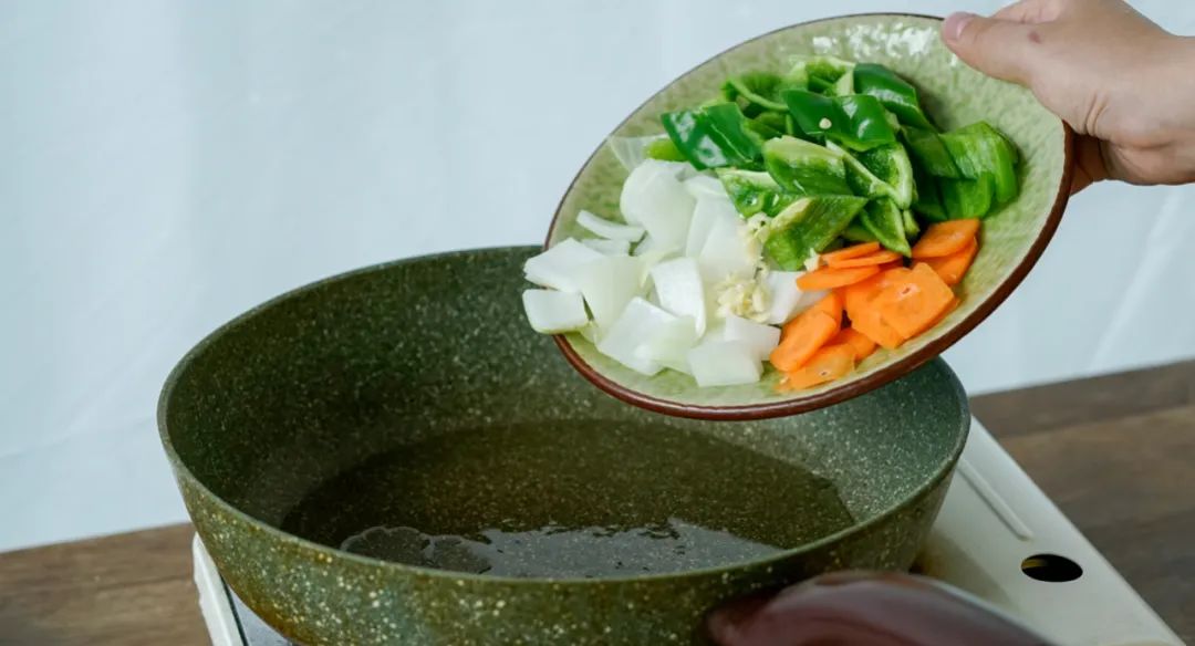 4.炒肉段:锅里热油,放入蒜末、青椒、洋葱和胡萝卜。