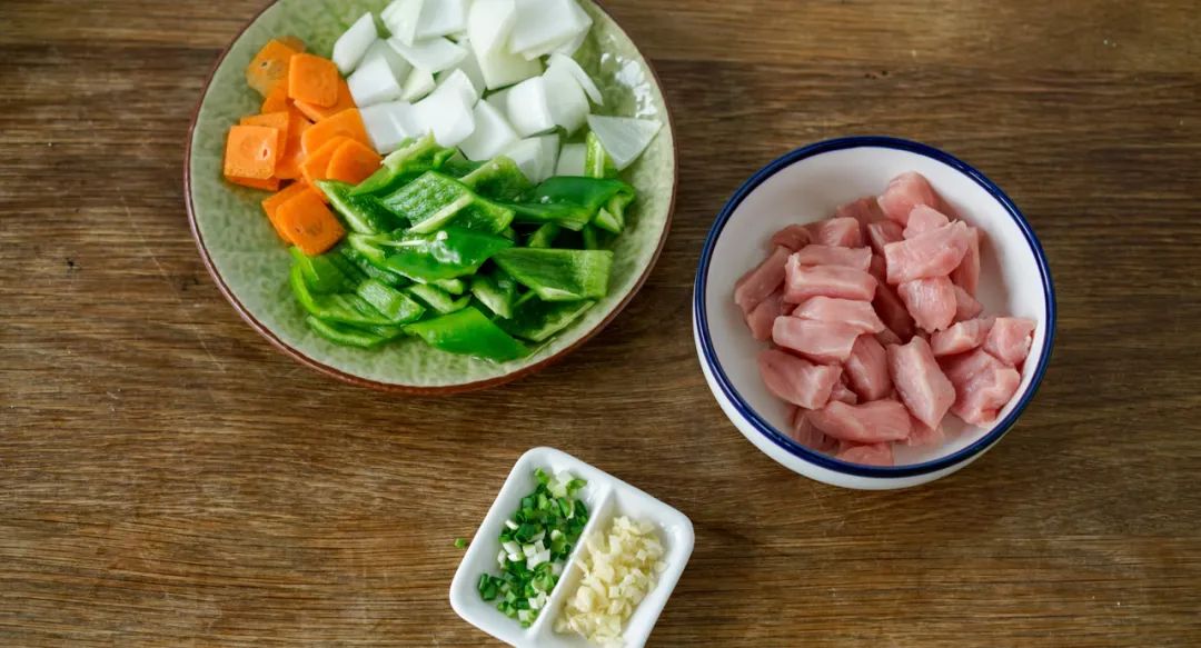 1.处理食材:青椒,洋葱,胡萝卜切条,蒜切成末,里脊肉切条