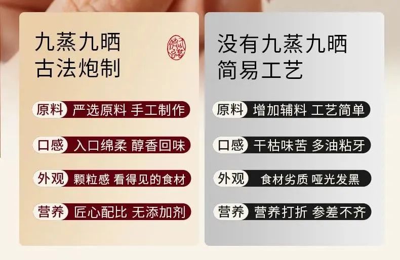 采用九蒸九晒工艺,让芝麻的营养充分分解,油腻性大为减少,不上火,更易于人体吸收。