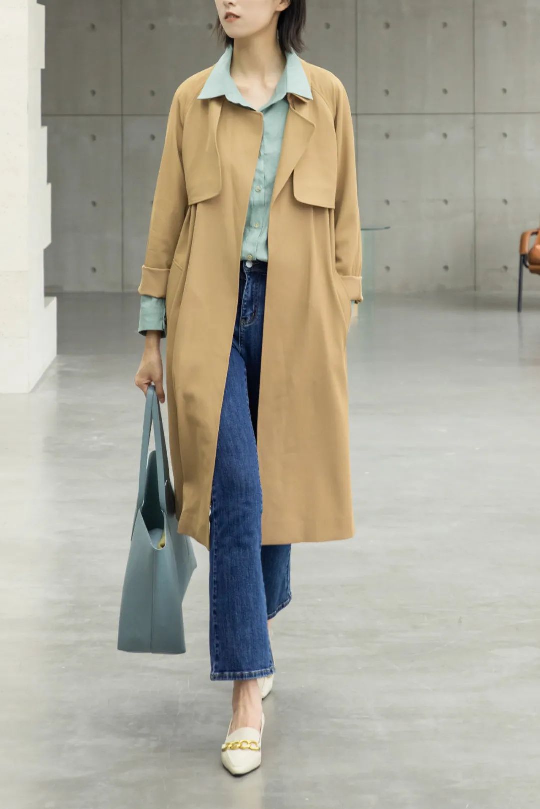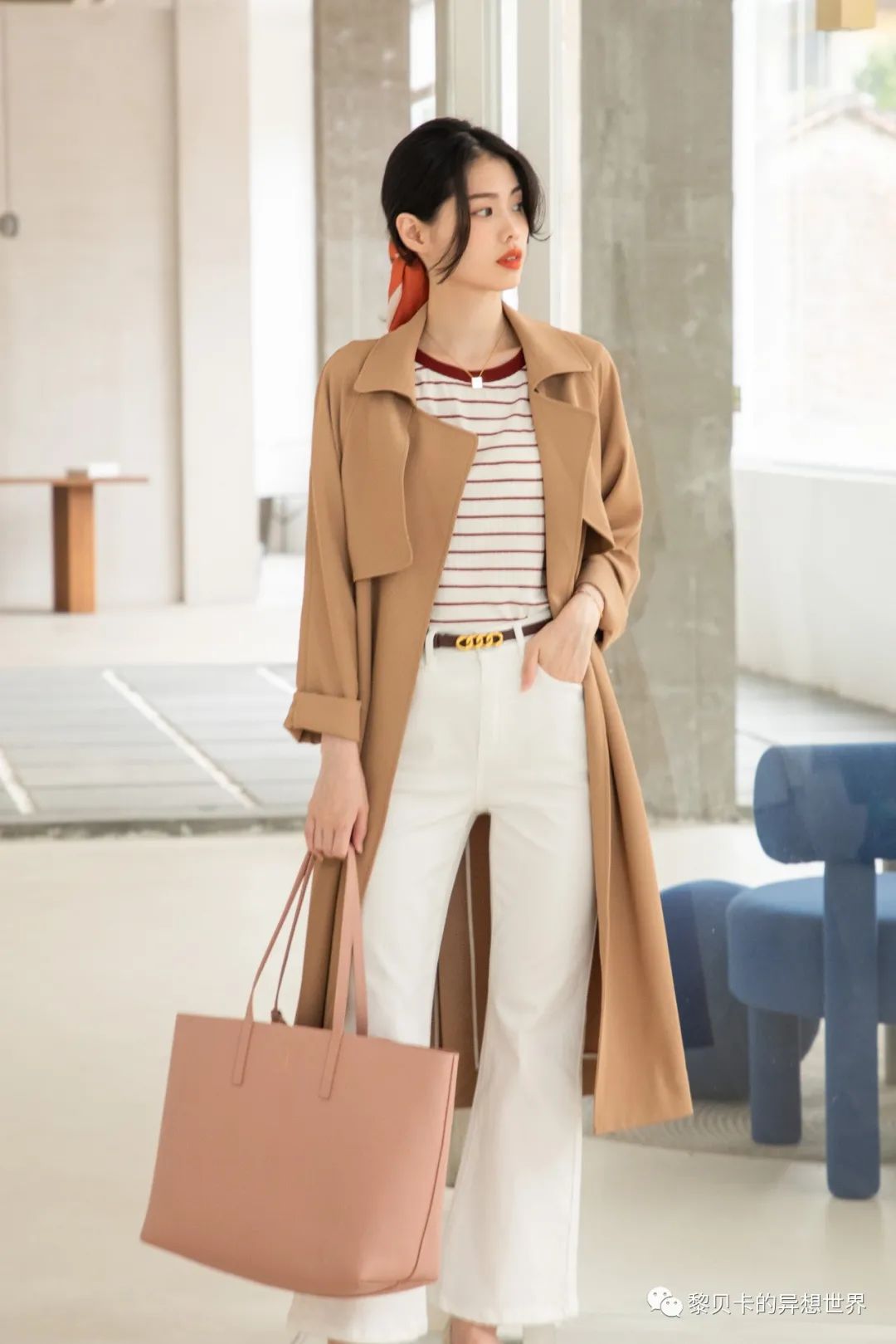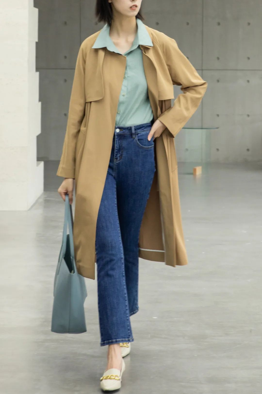 休闲上班装:风衣+彩色衬衫+牛仔裤