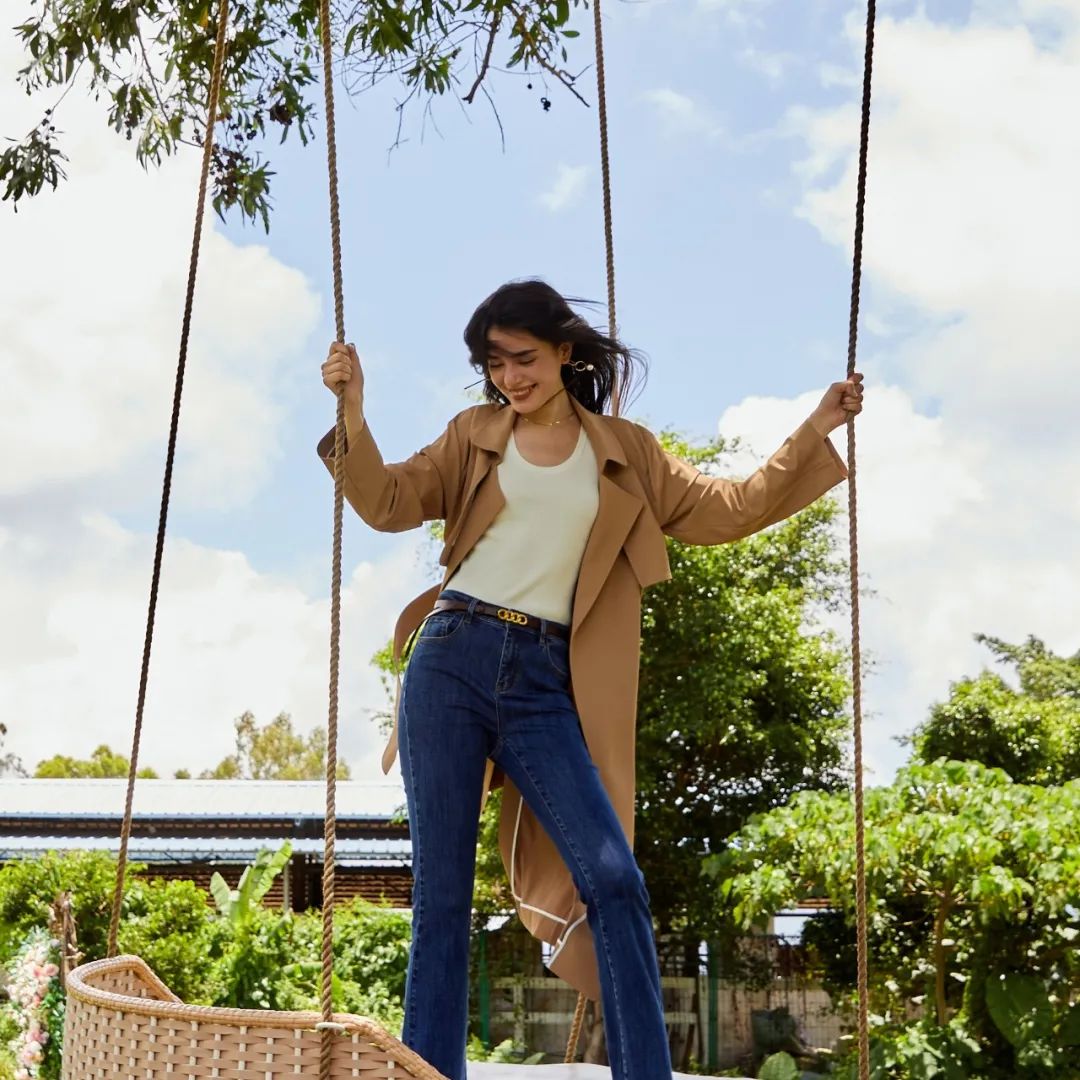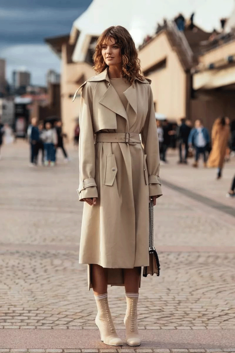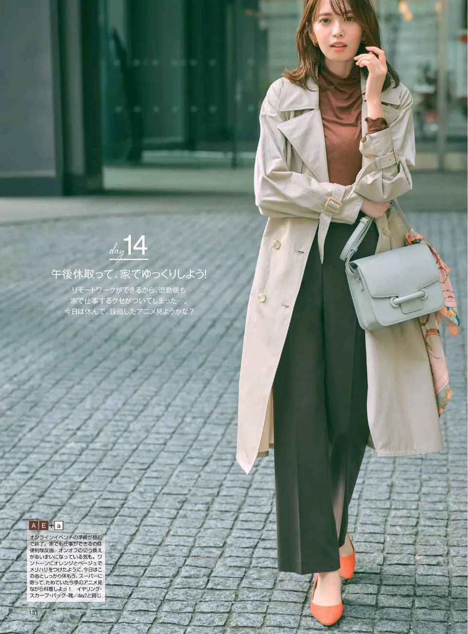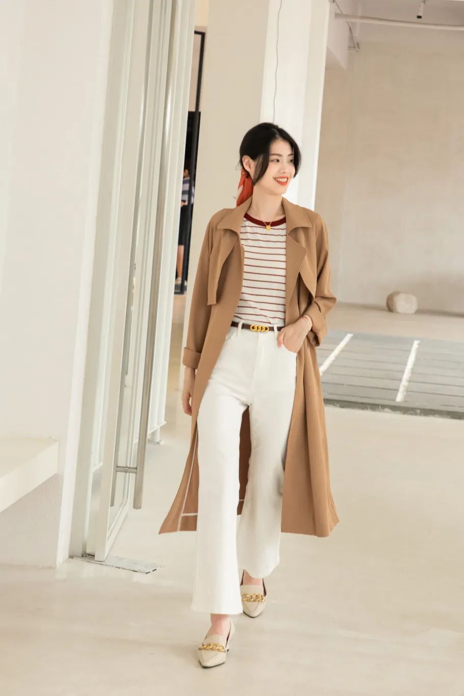 休闲上班装:风衣+彩色衬衫+牛仔裤