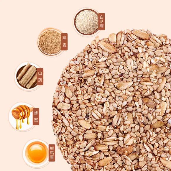 这款山药燕麦饼以山药、燕麦、白芝麻、蜂蜜、鲜鸡蛋作为基本原料搭配结合,但要使饼不散碎,又要做到不加糖、面粉、增稠剂、乳化剂等,这是一个很大的技术难点。