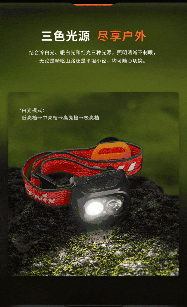 HL18R-T V2.0 具备三种光源,除冷白光之外,还具备 暖白光和红光。暖白光穿透性强,即使在雨雾天气,也能够切割开厚重的雨雾,让你清晰地看到前方的道路和潜在的危险;红光包括常亮和SOS档位,红光常亮在夜晚适合查看地图、减少蚊虫“骚扰”等,而SOS能起到警示作用,更好地为我们的户外安全保驾护航。无论是哪种场景,都能就能找到最适配的光线,让你尽享户外每一刻!