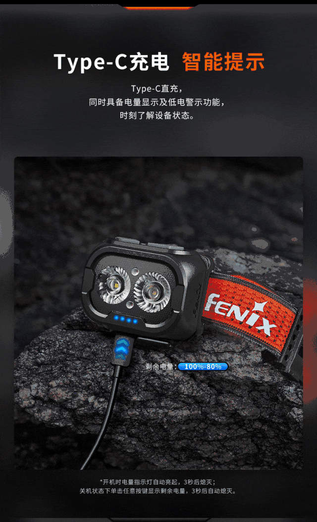 HL18R-T V2.0 采用Type-C直充接口, 让充电变得更加便捷高效。同时具备的电量显示及低电警示功能,能够时刻清晰了解头灯的电量状态,合理规划使用时间和充电安排。