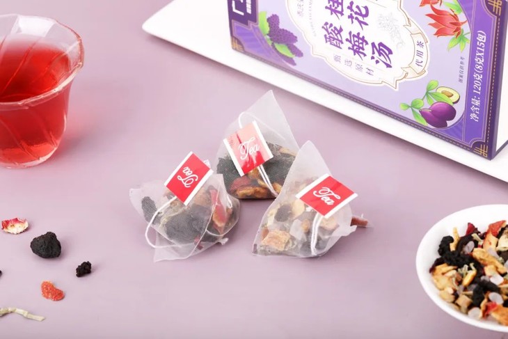 取出三角袋往杯子一放,再加入热水,就可以得到一杯纯正的桂花酸梅汤了。