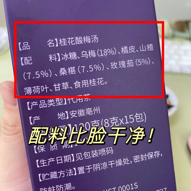 成分干净,只有乌梅、山楂、桑葚、玫瑰茄、可食用桂花、甘草、橘皮、薄荷这8种配料,再加适量冰糖!