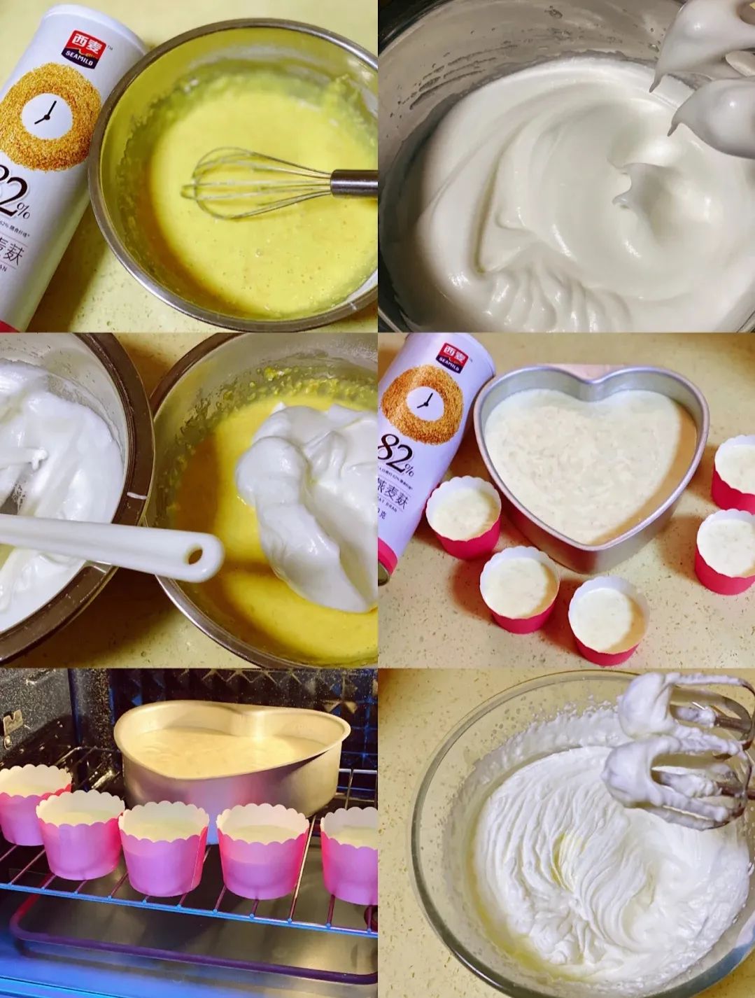 ⑤ 将打好的蛋白分两次加入蛋黄糊中翻拌均匀;