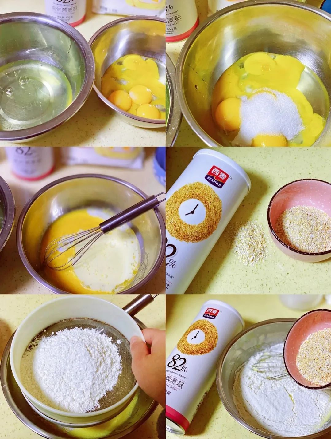 鸡蛋4只,玉米油40克,纯牛奶40克,低筋面粉70克,西麦高纤燕麦麸20克,细砂糖25克(放蛋黄),细砂糖60克(放蛋白)。