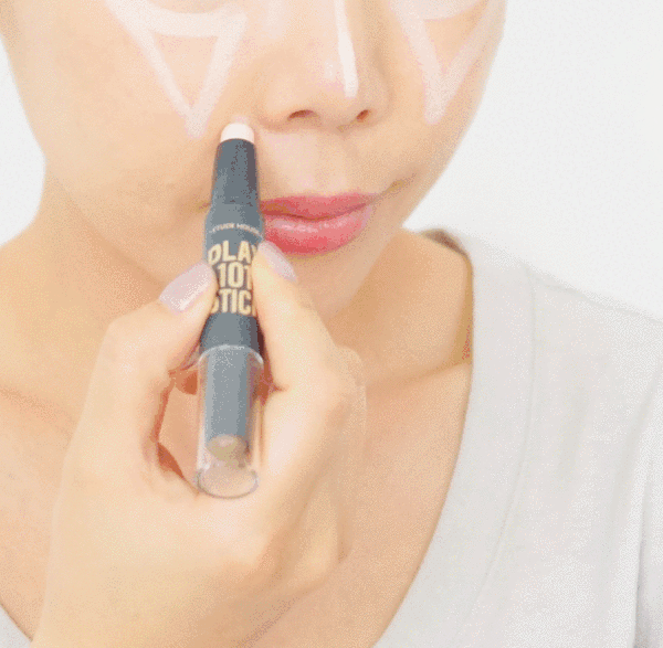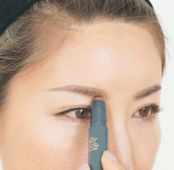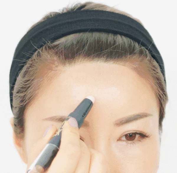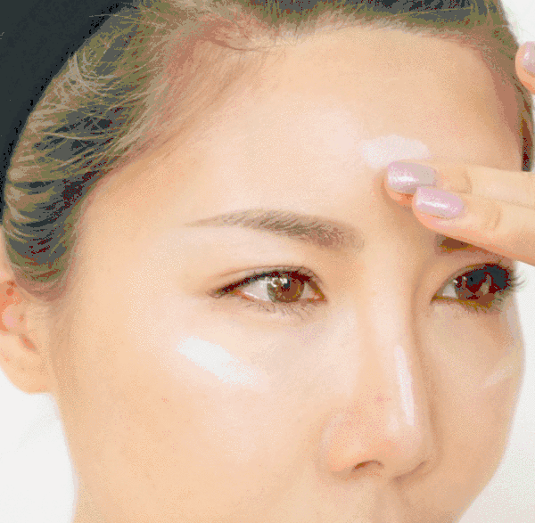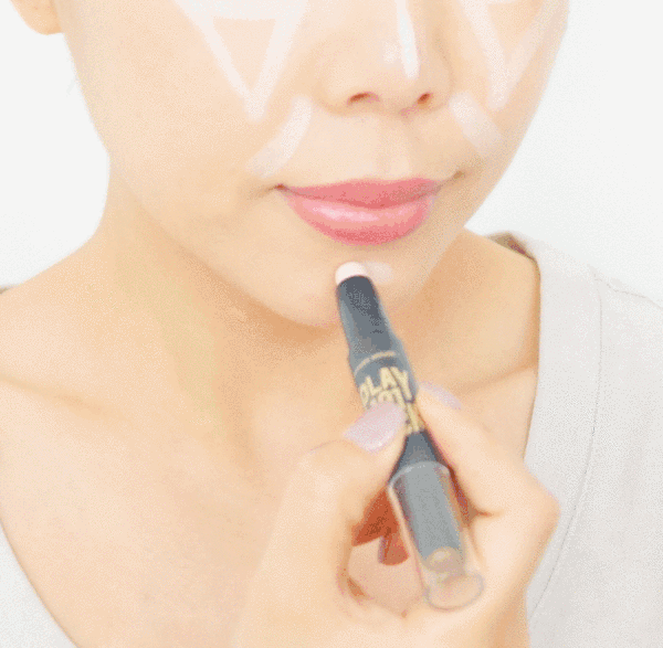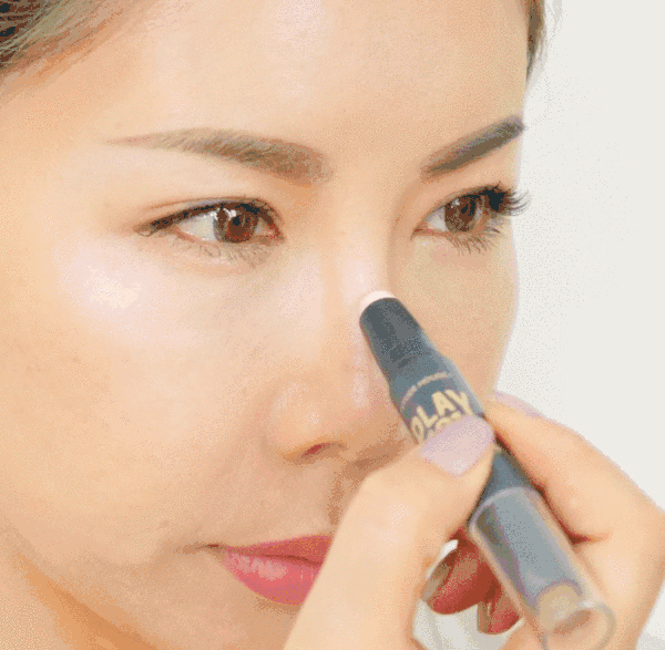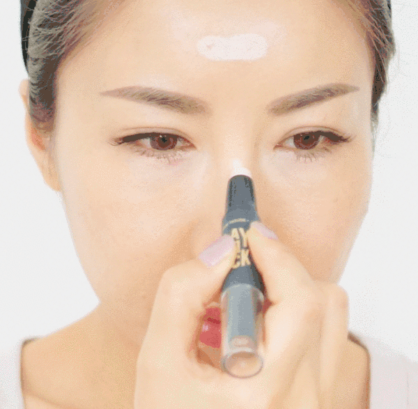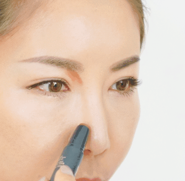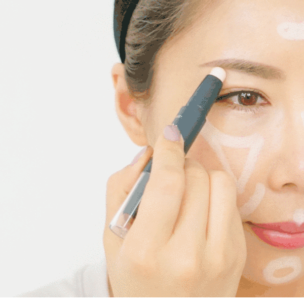 使用浅色笔头画在额头中央、鼻梁下三分之二处、眉骨、苹果肌和颧骨上侧、法令纹、人中、下巴。让脸部中央有立体感,隐匿脸部凹陷沟壑,减龄同时从视觉上提升肌肉走向。