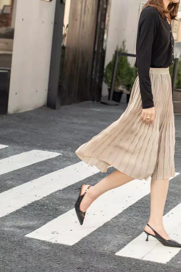 这款立体百褶裙的细节真的赞,每条褶上都多加了一层向内的小褶,这些褶皱非常重工,都是师傅人手一个个印上去,所以才会有深深浅浅、若隐若现的动态。让你每走一步都摇曳生姿。