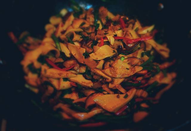 3、再放入选配蔬菜,比如洋葱、木耳、胡萝卜、青红椒等一起翻炒,汤汁收干,再微调盐味,出锅前点入少量香油。
