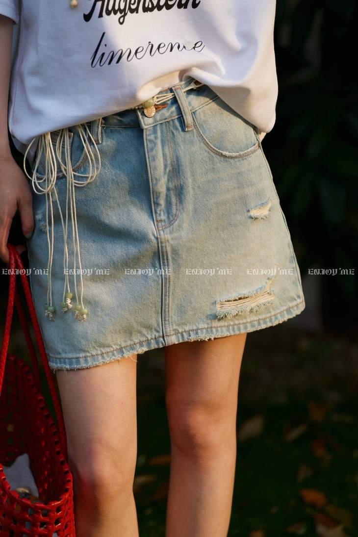 A字牛仔裙破洞与腰间垂坠的绳结共舞