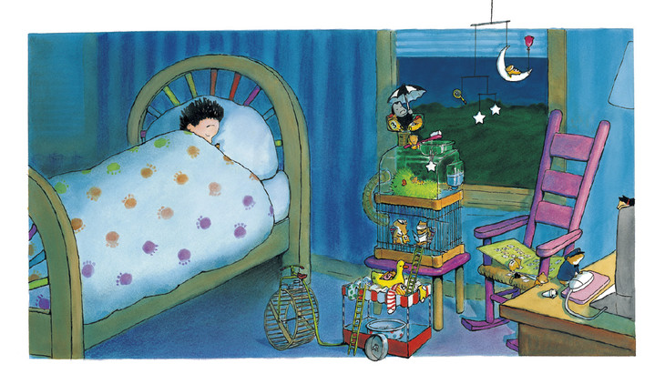 故事中的小男孩正与宠物仓鼠一起招待来观光的客人。在爸爸的倒数声中,一系列的观光项目被作者用丰富的画面表现出来。虽然文字量不大,但故事异常紧凑、连贯。随着游览的结束,小男孩也爬上床、进入了梦想。