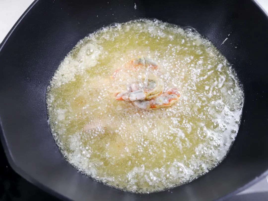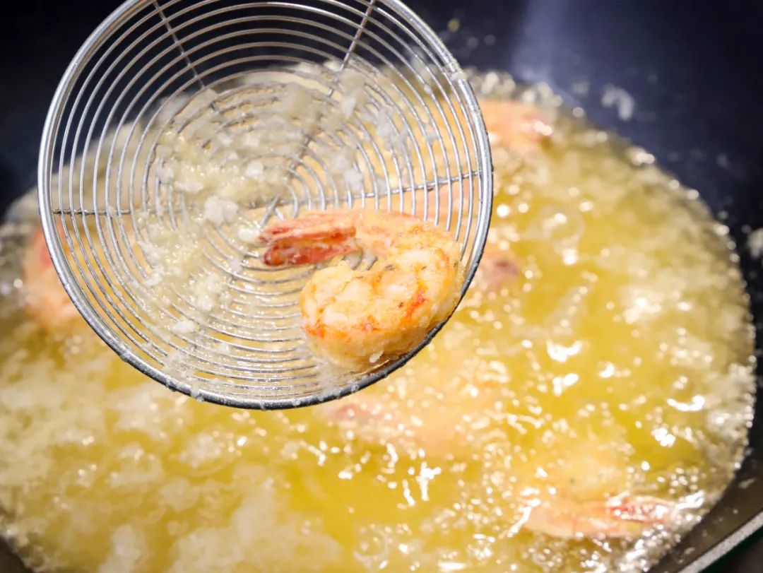 5.油锅炸虾仁(油温六十度左右的筷子插入油中,待筷子周围有小气泡就可以下虾仁了)