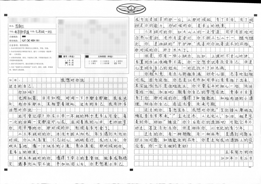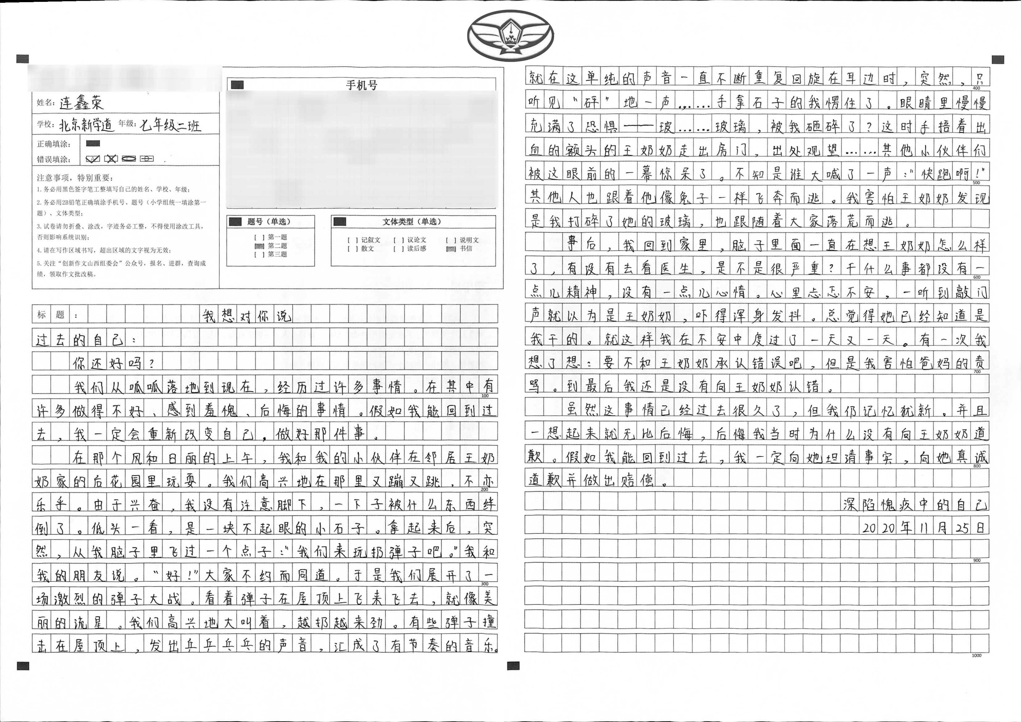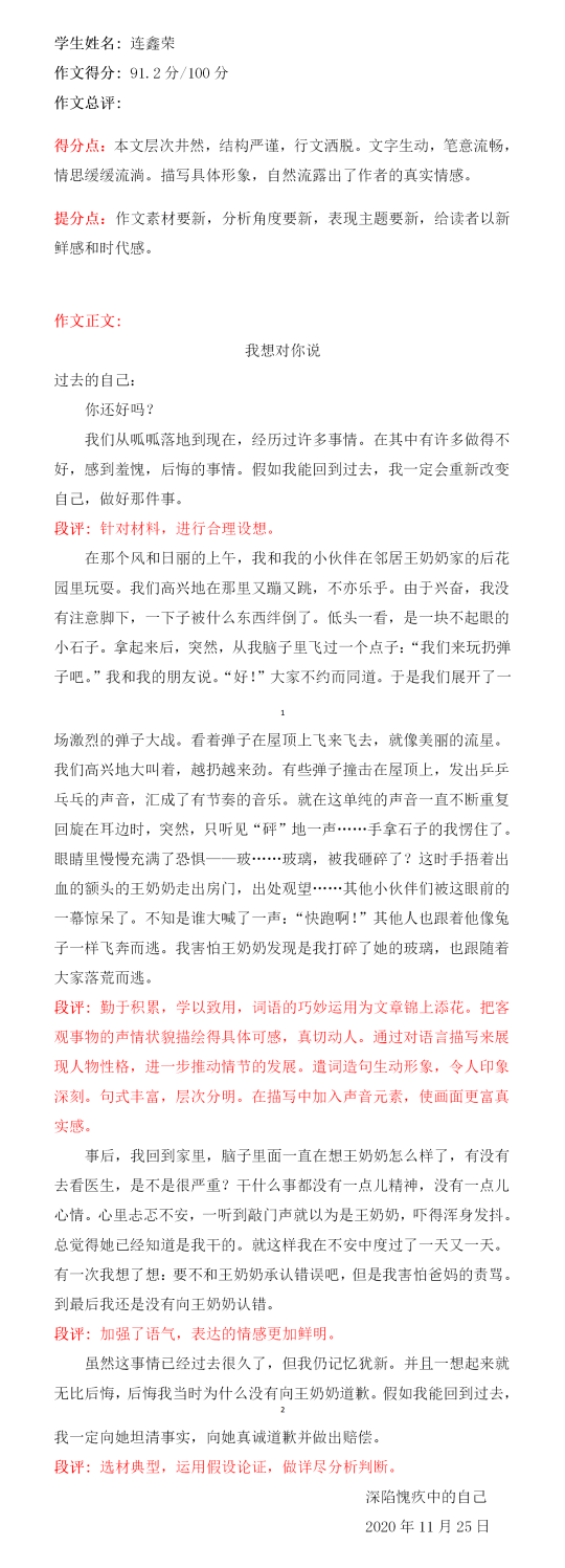 我这篇文章的题目是“我想对你说”,所以主题就是写给自己的一封信,诉说自己的过去,并明确改变的方向。所以我马上就想到了自己从前的过失,通过一件事实来说明,表达我自己的感受而且希望时空穿越重新做好那件“令我忏悔”的事。因此有了这篇文章。这次大赛,使我得到了更好的锻炼,希望我通过此次比赛,使我今后的作文能更上一层楼!