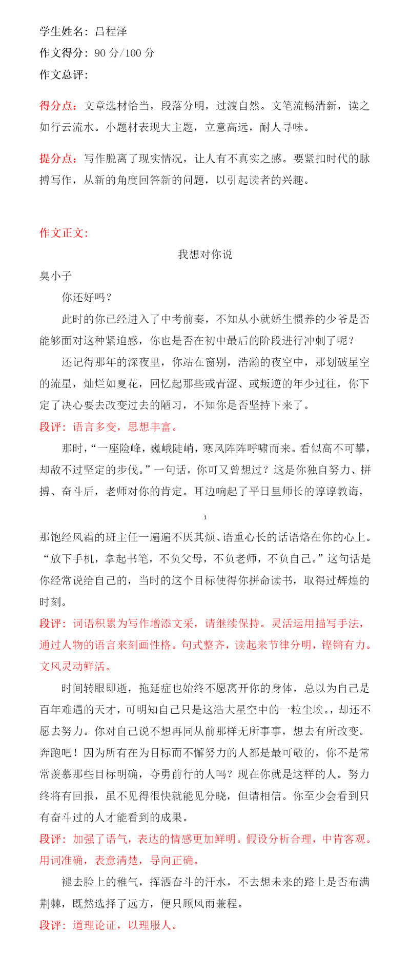 我始终认为提高阅读水平的关键还是脚踏实地,日积月累,愿他坚持下去,再接再厉,从而不断提高写作能力。