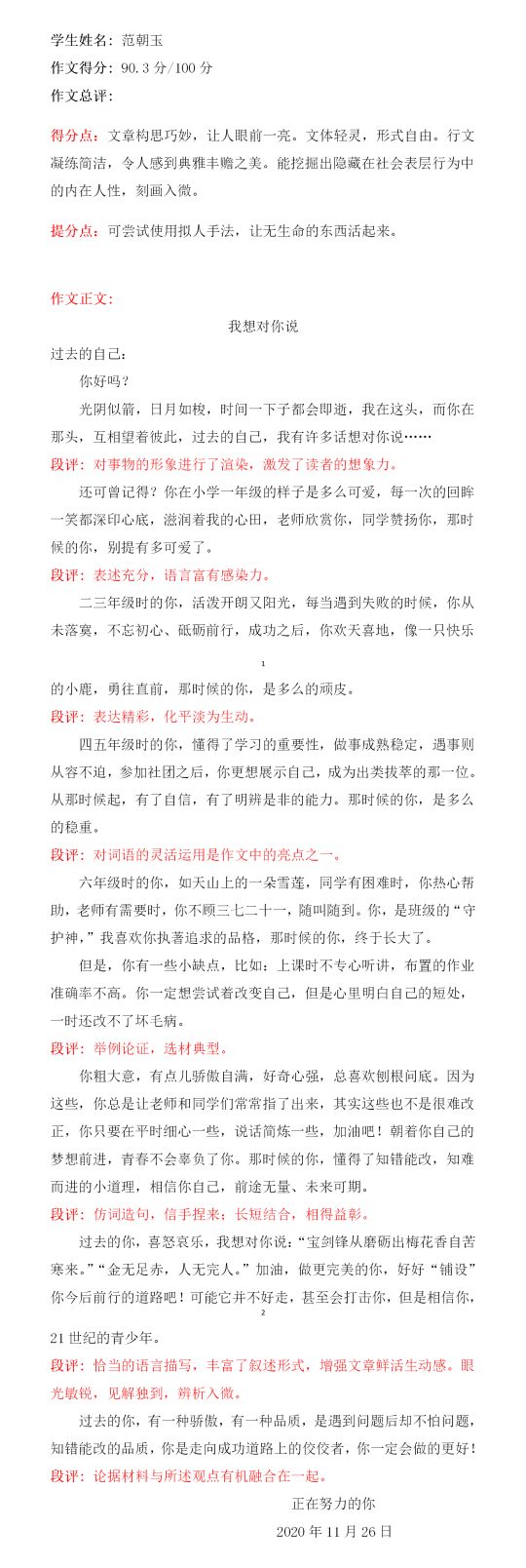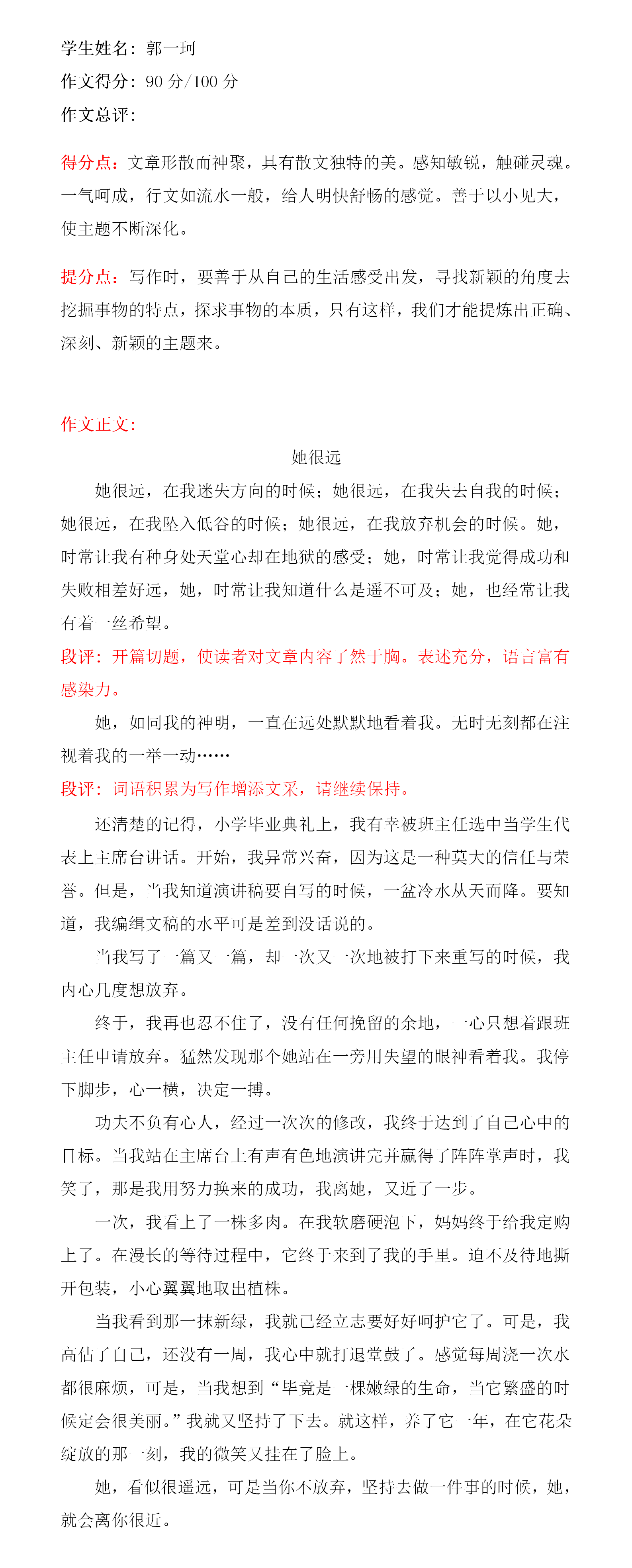 写作一定离不了平时的阅读和知识积累。作为家长我很高兴看到孩子的进步,希望孩子在新学期能够不断努力,取得更优异的成绩,这样才能不负老师辛勤的教导和期望,同时我们家长也会更加努力,创设条件让她看到更广阔的天地,累积更丰富精彩的人生,为此我们共同努力,加油吧!