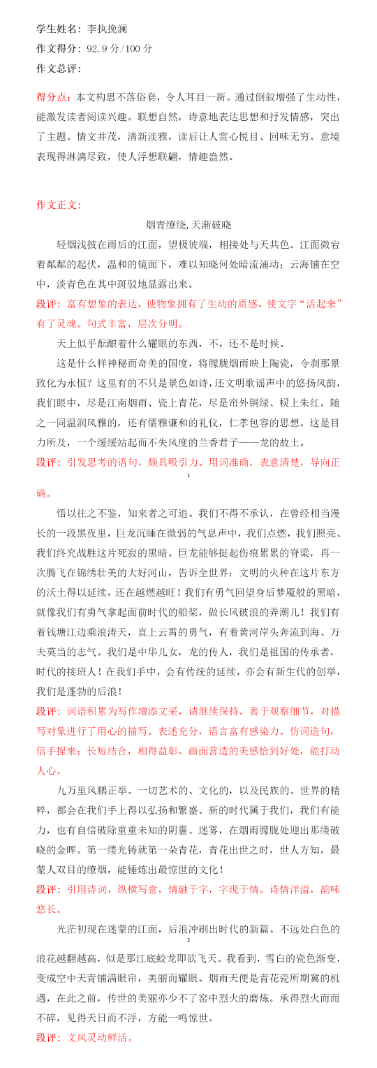 “读·思”是大语文学习中最经典,也最有效的提升方法。多方面广泛地阅读,加之以深刻长久的思考,常能使读过的事物内化于心,外化于行。我笔写我心,写我情,而非迎合谁的观点,在心中已有底蕴和情感后,笔尖下自然会迤逦流淌出对所爱、所想、所期冀一切事物的真挚肺腑,倘若还能有金庸前辈那般的家国情怀,作品读来想必铿锵振奋,扣人心弦。