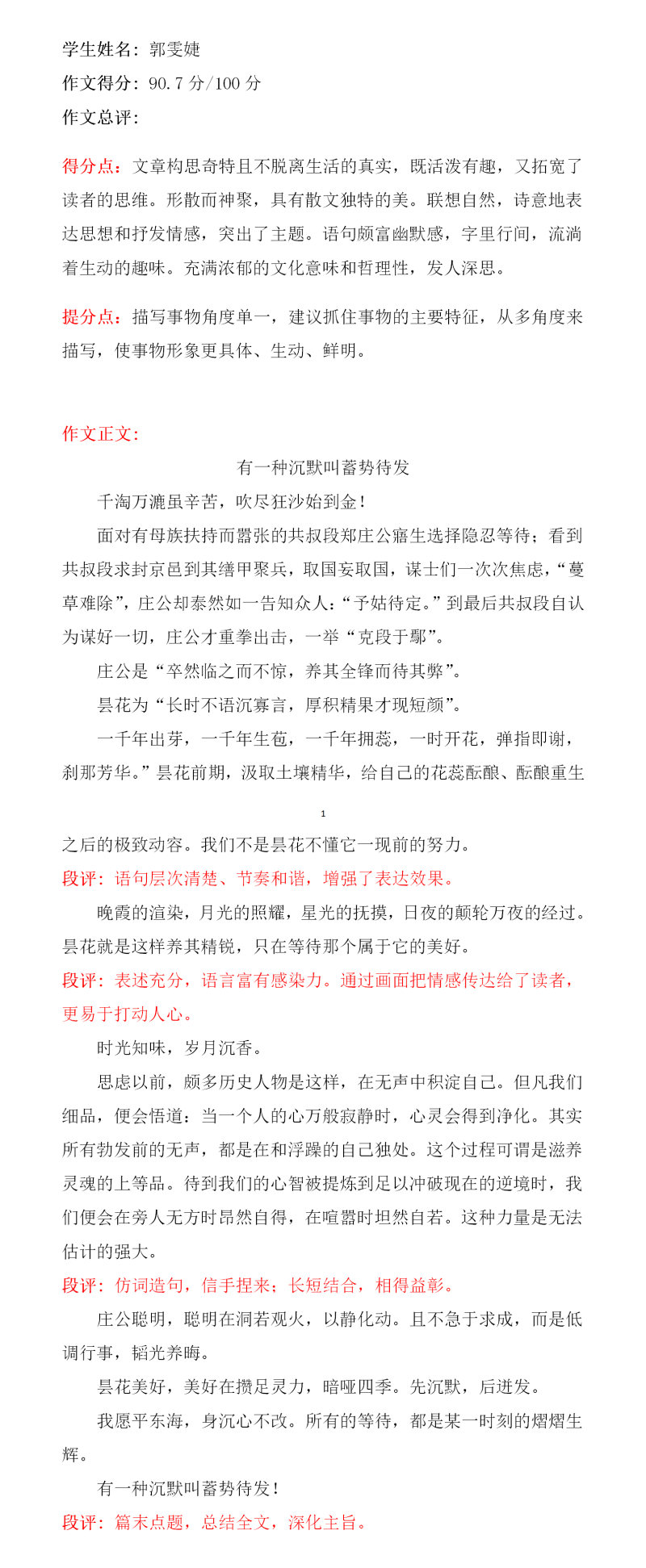华怡轩同学:她平日里酷爱读书,喜欢写作。在这篇习作中,她告诫自己,要经历苦难,无悔付出,懂得坚韧,才能自尝甘甜,创造出美丽的人生。这篇文章语言优美,小作者旁征博引、妙语连珠。希望华怡轩同学,一如既往地努力,打造出更优秀的自己!