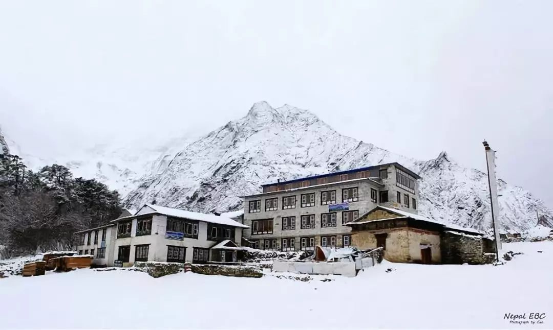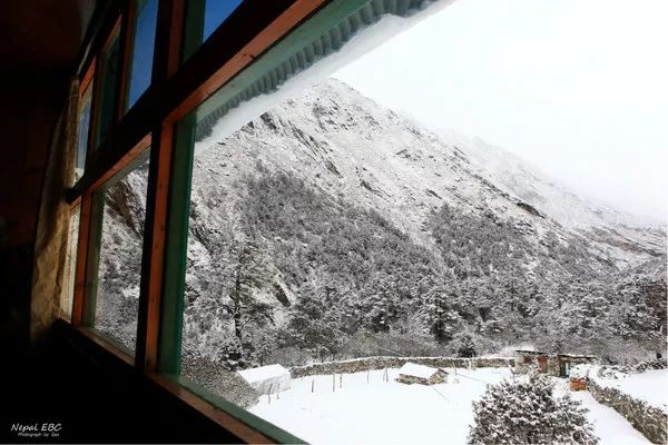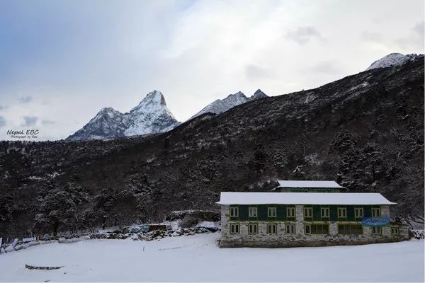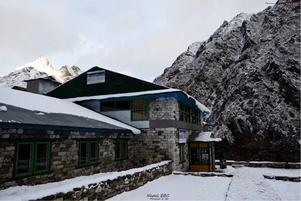 入住的客栈,因为下雪,向导告诉我们在Tengboche晚上会比较冷而且第二天早上雪路可能会结冰,先下行十分钟左右到达平地,相对安全一些。