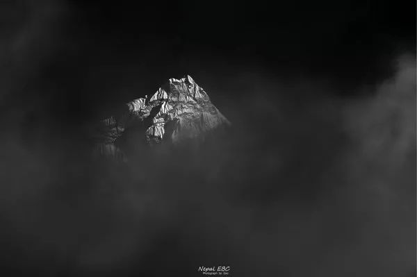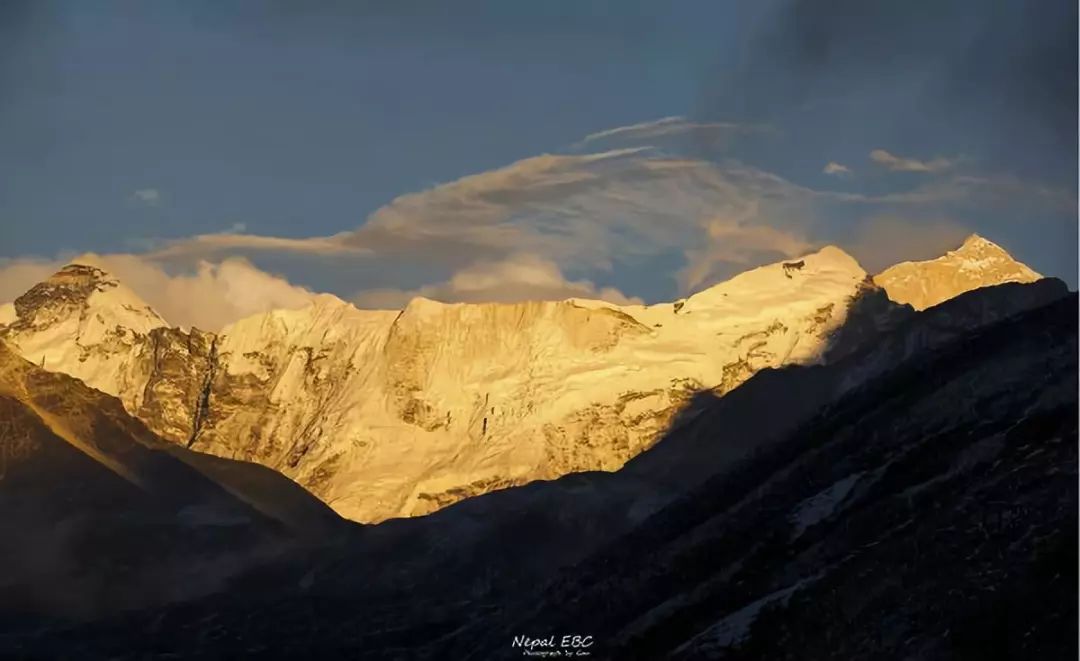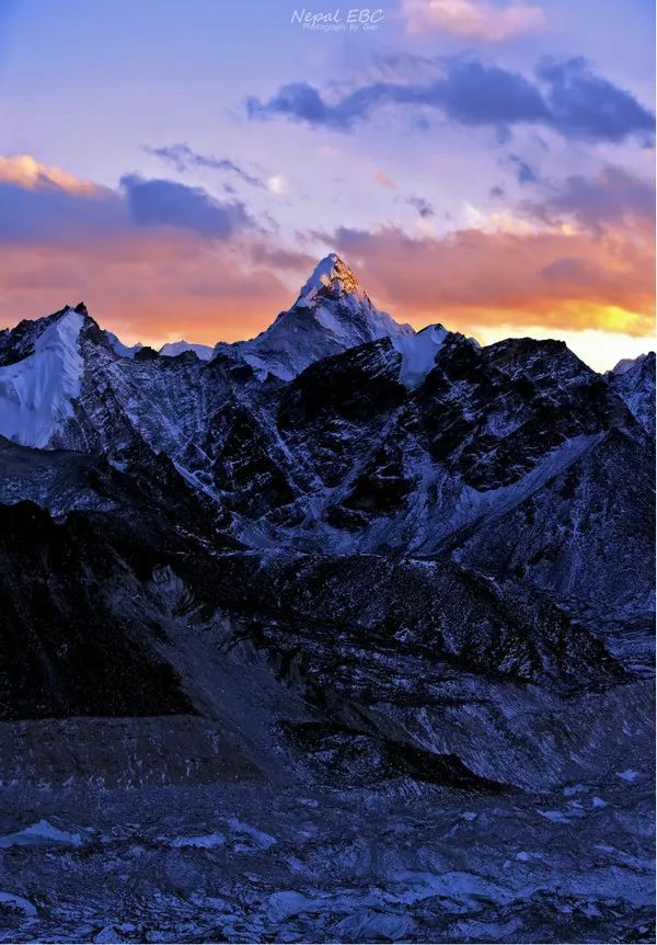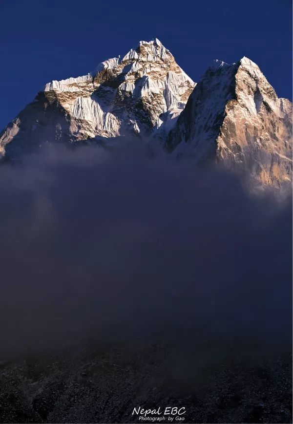 Ama Dablam的峰顶随着夕阳西下不断变换着它的色彩,而山腰间的云,始终环绕不去,有一种飘渺虚无之感。