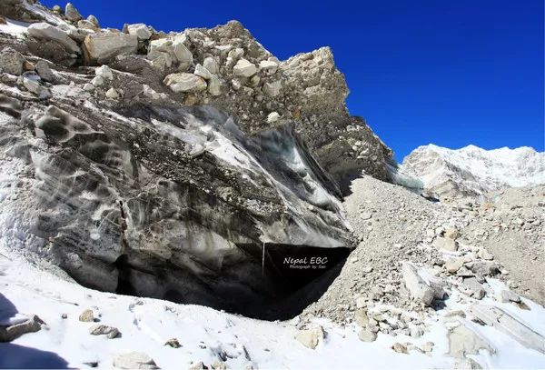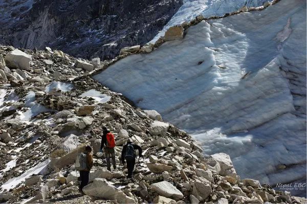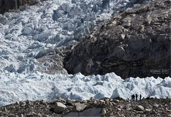 起初一直以为自己走在碎石路上,直到看到碎石下的冰层,才恍然大悟,原来不知不觉间我们已经走在了昆布冰川之上。