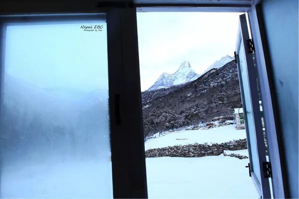 第二天早上,迷迷瞪瞪睡不着了,推窗第一眼,看到Ama Dablam,一座6812米高的雪山,放眼亚洲以外的其它地方,这个高度足以使其傲视6大洲。
