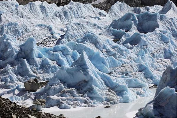 鼓起勇气,走到冰塔林旁,找了一个较矮的冰塔合影,做个对比。冰塔林完全不像脚下的冰川,被巨砾碎石岁覆盖 ,晶莹剔透的冰体,在阳光的照射下呈现出不同的蓝色,至纯至美。