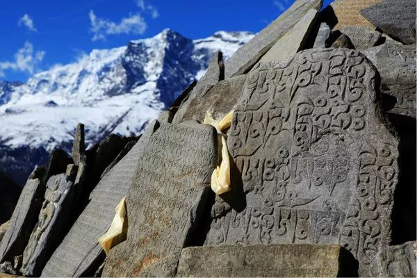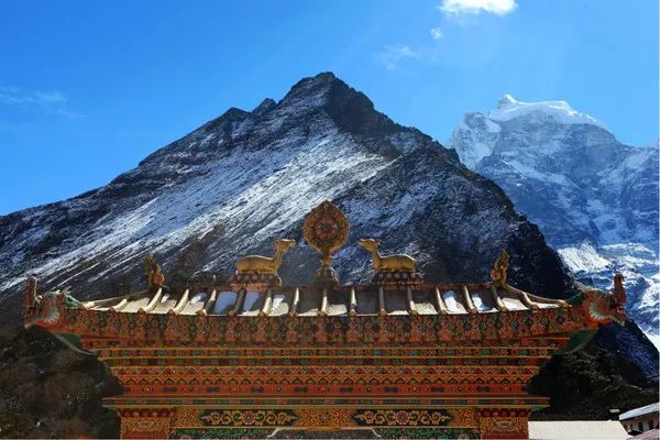 蓝天白云,雪山庙塔还有五彩的经幡,绝佳的色彩搭配 。