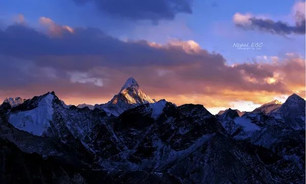 日落中的群山,Ama Dablam尖尖的峰顶格外显眼,图中间远端的山峰就是马卡鲁。