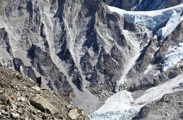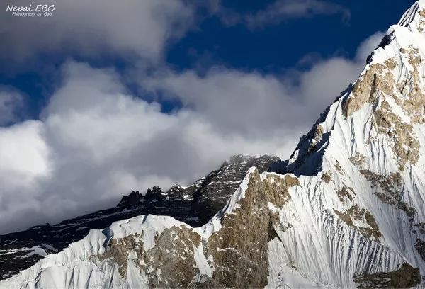 喜马拉雅山脉巨大的岩壁上厚厚的悬冰川,我们在这里只是一个匆匆过客,说是我们在看山,其实何尝不是山也在静静地望着我们呢?