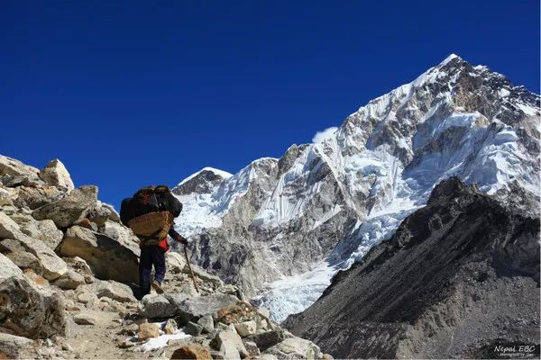 第二天从GoraK Shep出发,前往EBC的路上,行走在碎石路上。