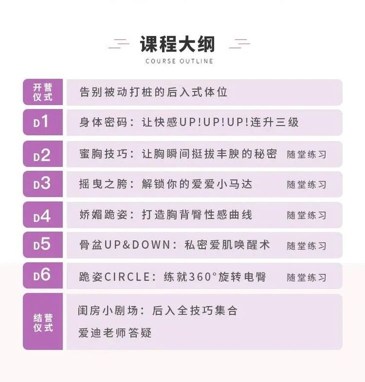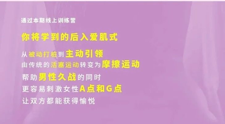 在《360°旋转后入技巧》线上训练营中,爱迪老师会先带大家“重塑认知”,讲解女性身体密码和探索A点、姬点的方法。