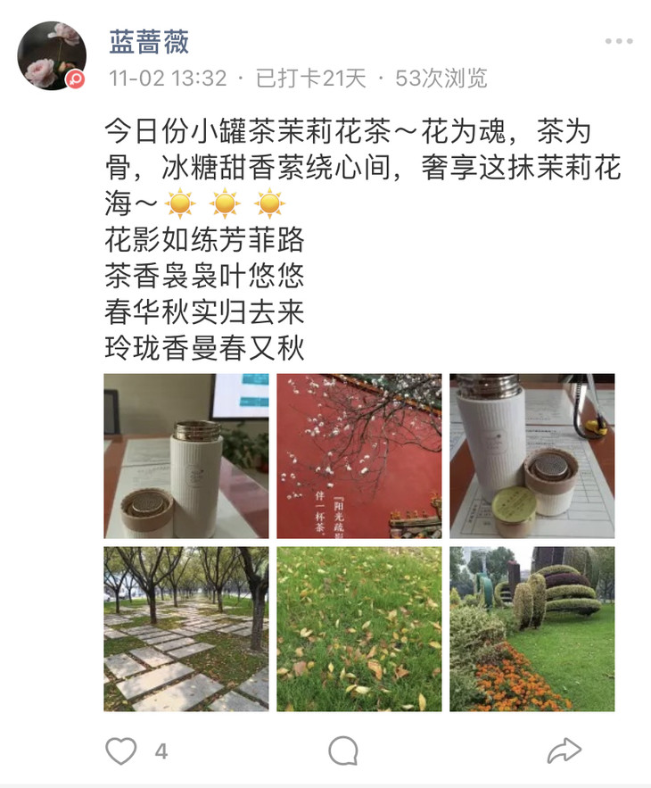 9月28日,罐粉365打卡活动正式开启,其实我们不止是个打卡群,更希望是个分享茶生活的群。2个月里,我们收获了很多新鲜的晒图和不一样的故事。