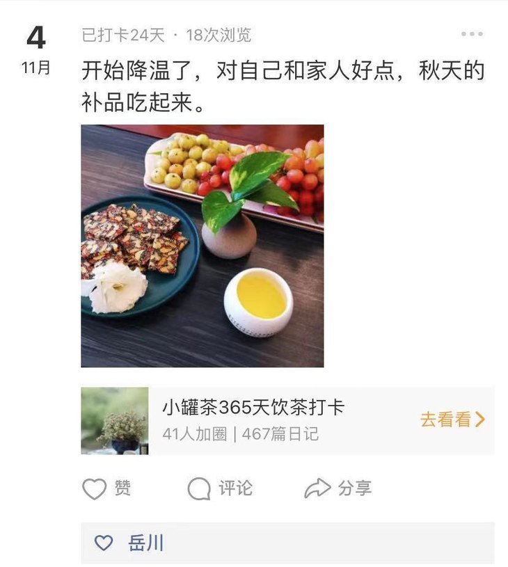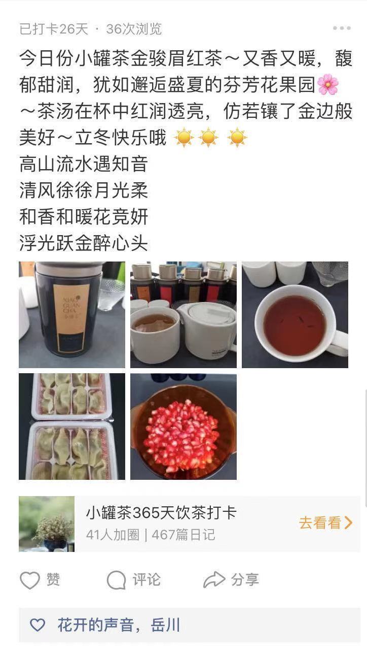 如果你也想参与进来,欢迎加入罐粉365打卡群,在这里,你可以自由发挥,发表生活感悟,和茶友互相交流,通过图片/视频/文字的形式,与更多人一起分享茶生活的快乐。