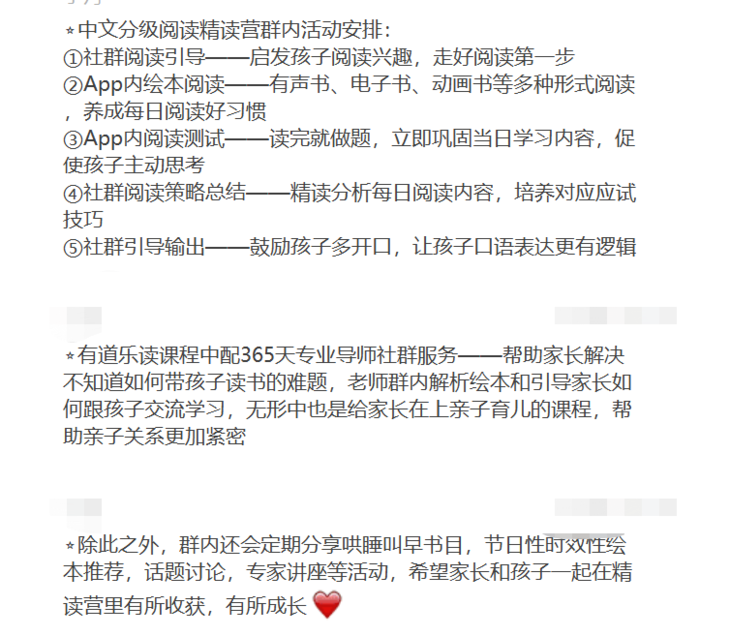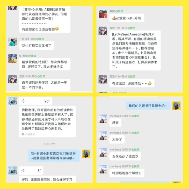 ————💛———— 单单有这么优质的阅读产品还不算王炸,更有性价比的是,有道还特别提供了长期的课后社群伴读服务。 基本上每天的学习是这样的: 在伴读社群中,老师会给大家介绍当天的推荐书目:包括书籍的内容简介,获得过的奖,还有学习这本书的目的。 介绍这部分内容的目的,就是让孩子建立起一个阅读的心理基础,从而获得对书本的好奇感,带着兴趣读下去。 读完之后会有社群内老师的精读分析,也就是对于今日推荐阅读书目的总结和提问。 下面这个就是我们在和有道的老师做试运营时,群里的辅导情况。
