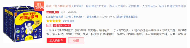 除此之外,还有一部分科学启蒙入门类图书,例如《给孩子的万物启蒙书》系列,覆盖到几个阅读阶段,我觉得也是非常适合孩子的信息文本阅读材料。 ▼这套书在国外已售超过1400万册,国内版本的纸质书定价高达988元,单单看完这一套书,这个阅读产品也就非常超值了。