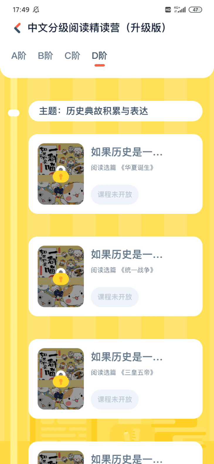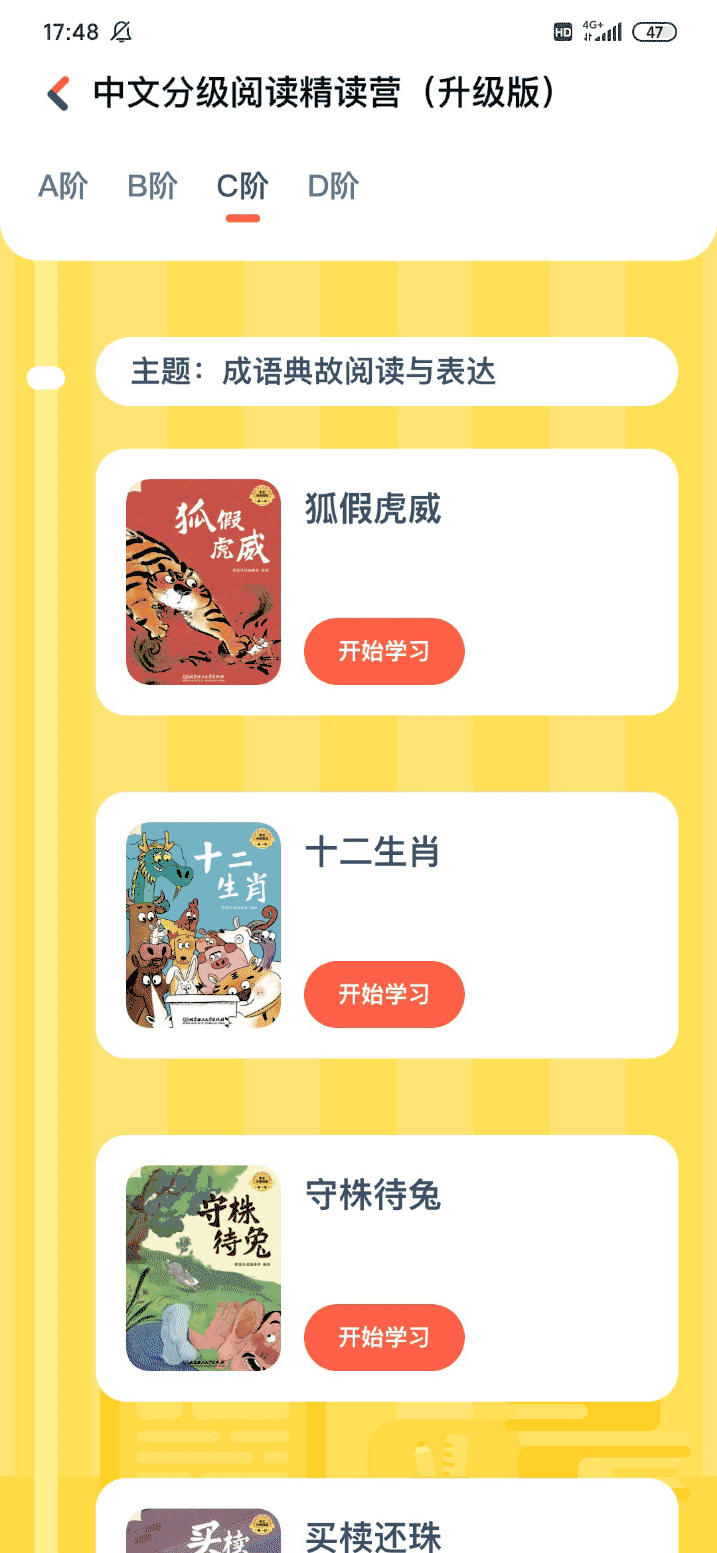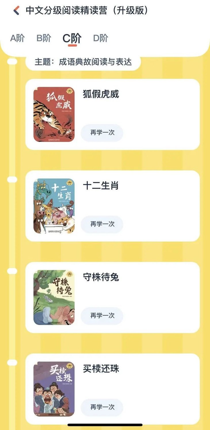 ▶到了C阶段和D阶段,就开始逐步和新课标对应,增加了成语典故、寓言故事、名著篇章阅读等类别的刚需内容,如《狐假虎威》、《买椟还珠》、《安徒生童话》以及传统经典《美猴王》系列。