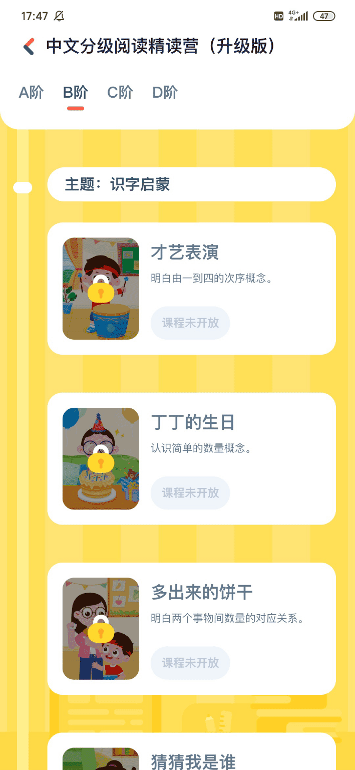 【B阶培养体系 适合4-6岁】 ▶4-6岁是阅读的启蒙期,划分为B阶,在这一阶段需要听看结合,增强阅读互动,促进语言表达运用; ▶为了进一步增强互动阅读,我们在精读营后的每日习题中的开放式问题会更具互动性,在互动中激发孩子的表达力和阅读力。 ▶安排主题:关于性格培养和情绪管理、关于儿童财商培养和情商培养、关于自然科学和生命科学、经典绘本(比如巴巴爸爸和帕丁顿熊)