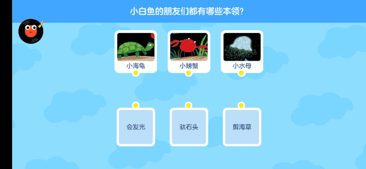 ▶闯关环节+打分机制,激励孩子勇敢表达,并逐渐建立表达自信 有道针对每一本绘本,课程内都会有专门的阅读评测环节,不光有记忆训练的情节题,还会有让孩子开动脑筋的思考题。 ▼