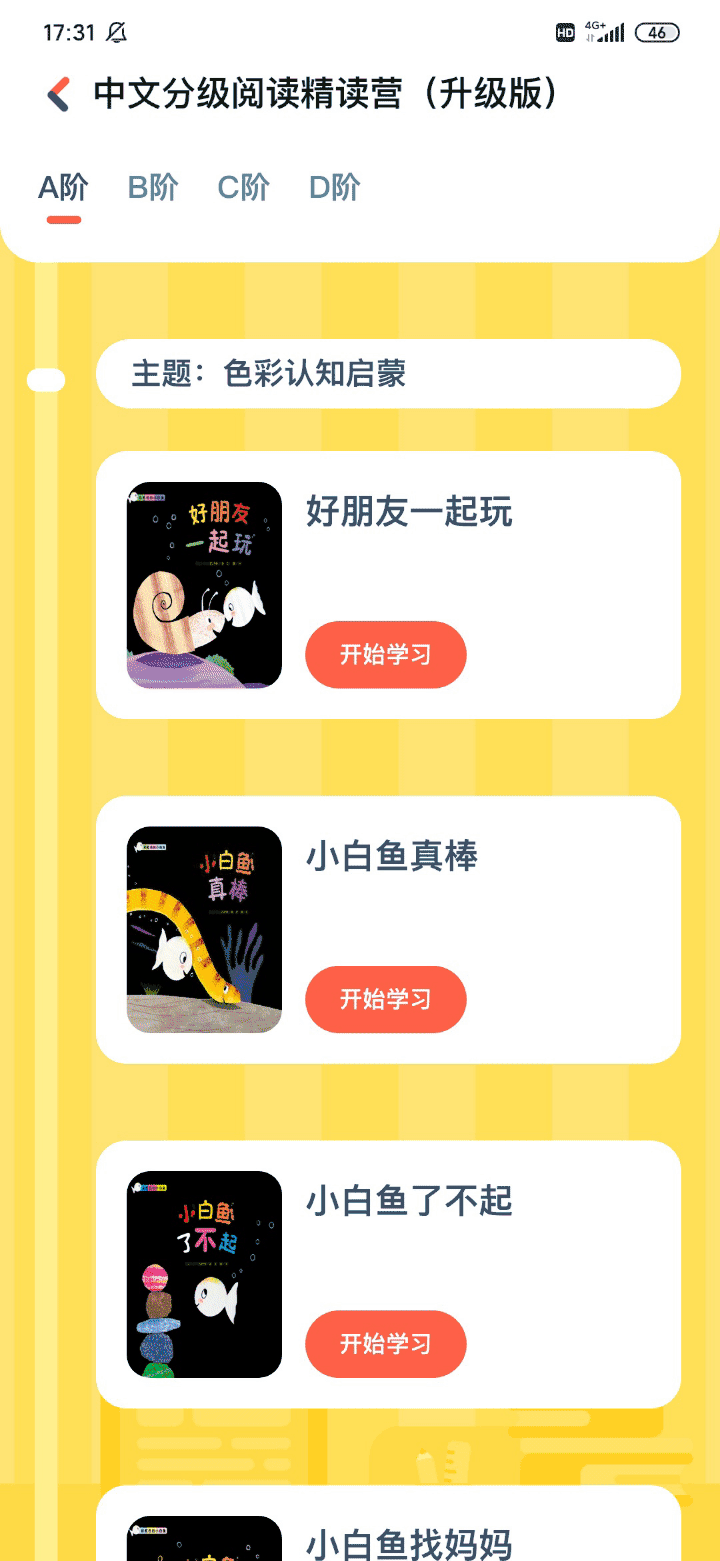 ▶在A阶段,给孩子安排的有色彩认知启蒙类的书籍,如大奖绘本《彩虹色的小白鱼》系列,和自主表达能力训练类的书籍,如《小辫子凯蒂》系列。 ▼这些绘本不仅主题温馨,还能兼顾到幼儿阅读的视觉刺激、色彩启蒙、社会交往启蒙等多个方面。