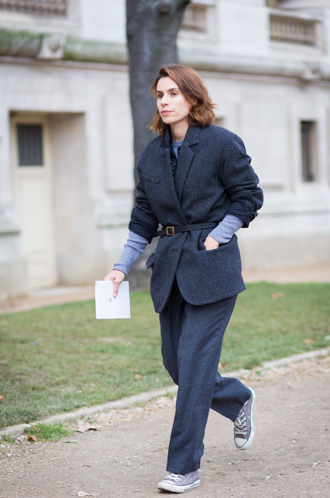 时装撰稿人Alice Cavanagh的搭配更有想法,西装内搭的薰衣草色毛衣,刚好呼应脚上的紫色Chuck 70,谁说彩色匡威是学生鞋?