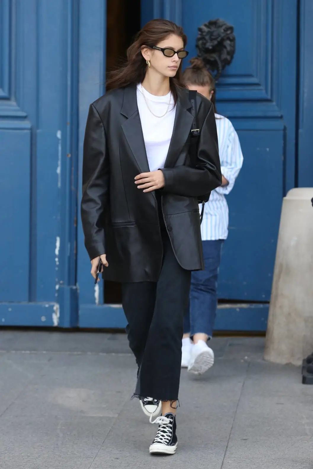 升级后的Chuck 70,自然更受时髦人喜欢。腿精超模Kaia Gerber就靠一双海军蓝Chuck 70搞定所有造型,无论是搭西装或是裙装,都毫无违和感。
