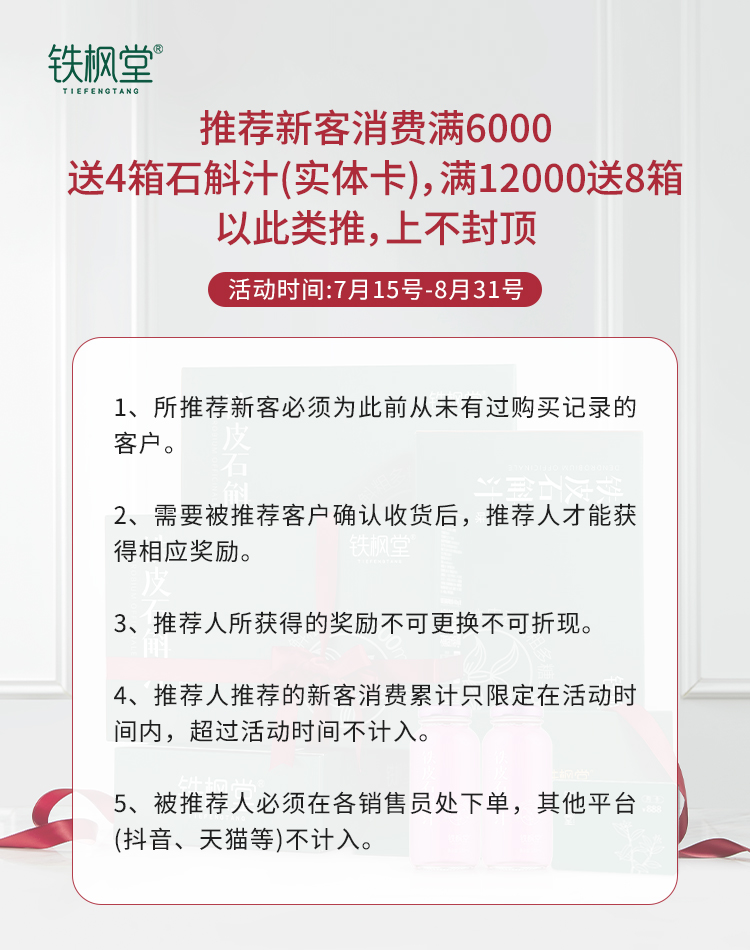 ✅推荐新客消费满6000,推荐人可免费获得4整箱铁皮石斛汁(实体卡)