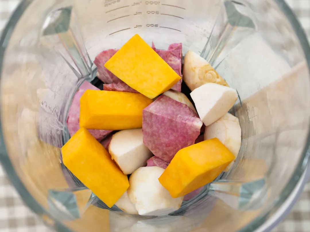 还有宝宝的辅食,有了科西破壁机也是轻松搞定,将南瓜、紫薯、山药一起放入杯内。
